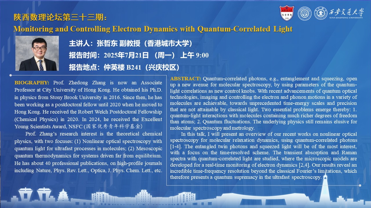 【陕西数理论坛第三十三期】—— Monitoring and Controlling Electron Dynamics with Quantum-Correlated Light