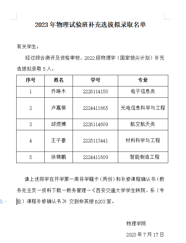 2023年物理学(强基计划)补充选拔拟录取名单