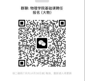 4月27日前,将电子版《个人简历》(格式不限,须包含个人基本信息、授课经历等主要信息)发至邮箱:[email protected]。同时,报名的老师请扫描二维码加入大学物理授课报名微信群: