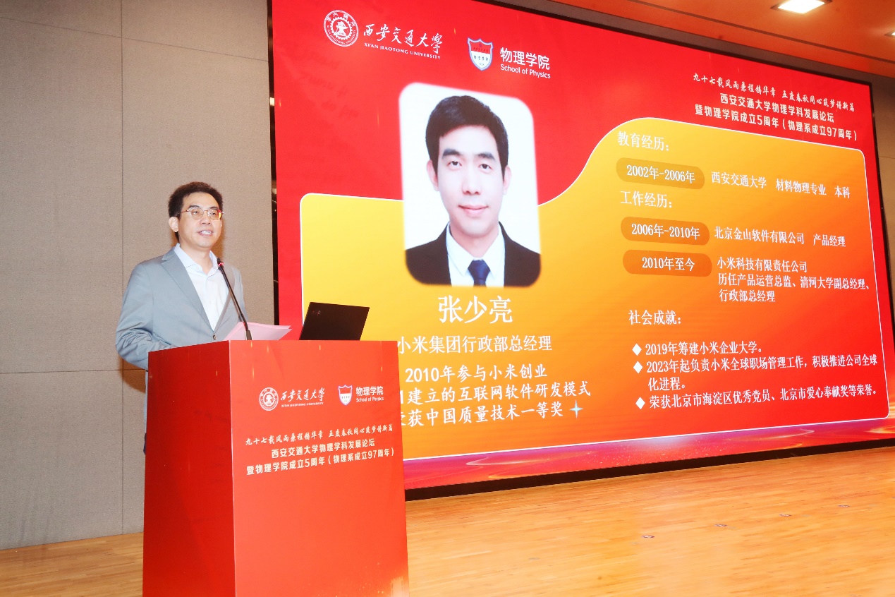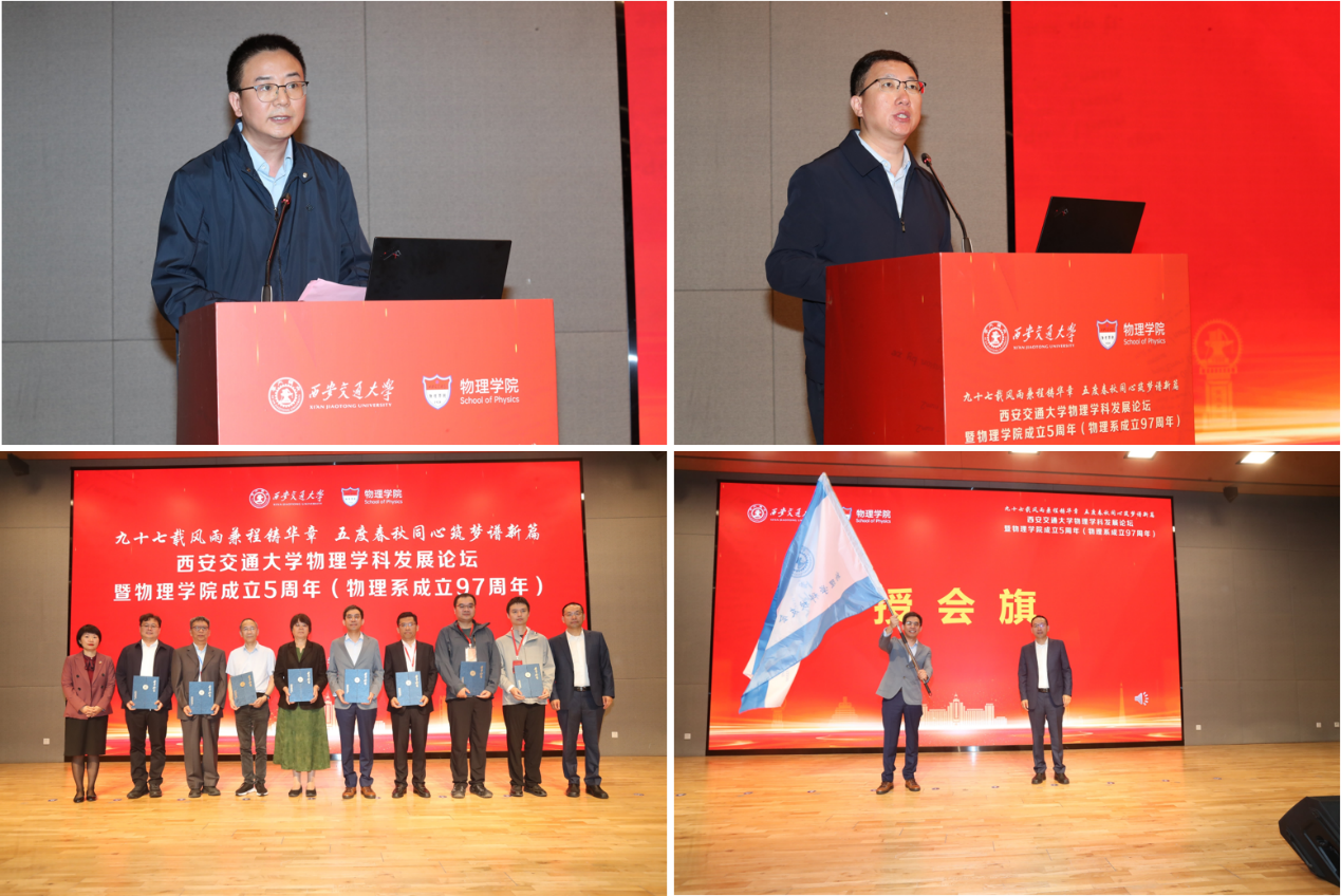 物理学科校友会成立仪式。物理学科校友会筹备组副组长张沛向大会报告校友会筹备成立情况。校友关系发展部主任许佳辉宣读了批复。单智伟为物理学科校友会理事会成员颁发聘书,向校友会首任会长张少亮授会旗。张少亮作为首任西安交大物理学科校友会会长发言,他深情回顾了在母校求学的美好岁月,分享职场感悟。他希望能与各位校友团结凝聚,共同搭建校友与母校、校友与校友之间的情感与事业共同体,以项目合作助力个人成长,以开放平台激活群体资源,让西迁精神与物理人的担当精神薪火相传。