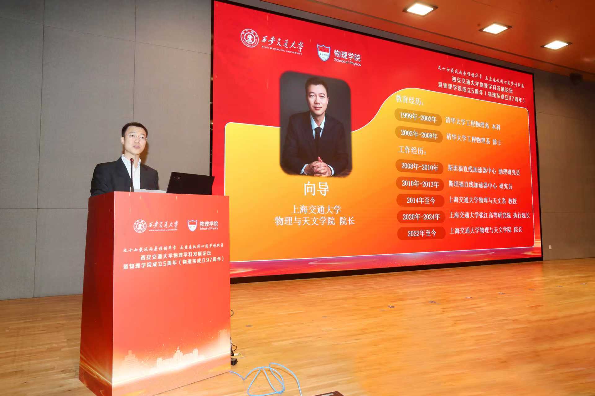 上海交通大学物理与天文学院院长向导教授代表兄弟高校致辞,他表示,期待以此次大会为契机,进一步深化双方在人才培养、科研攻关、师资建设上的交流合作,共同探索物理学发展的新范式,为解决国家卡脖子技术问题、实现高水平科技自立自强,贡献智慧力量。