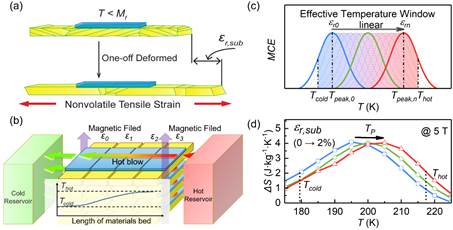 王宇教授和杨森教授提出了一种新型“磁卡合金/形状记忆合金”复合结构,利用形状记忆合金衬底产生2%的大非易失残余应变,在不改变磁卡合金化学成分的前提下,成功将应力不敏感型Mn-Cr-Sb-Ga磁卡合金的相变温度提高了6 K;在1 T的低磁场下,一组复合结构的有效制冷温区可拓宽至31 K。此外,该工作还针对性地构建了“反铁磁-亚铁磁”相变磁卡材料的朗道理论模型,并指出磁弹耦合效应决定了高温亚铁磁相在受载荷时的稳定性,是Mn-Cr-Sb-Ga磁卡合金中应变调控相变温度的物理起源。基于实验与计算结果,该工作提出了一种改进的主动蓄热式磁制冷循环,为制造小型高效磁制冷器件提供了新思路。