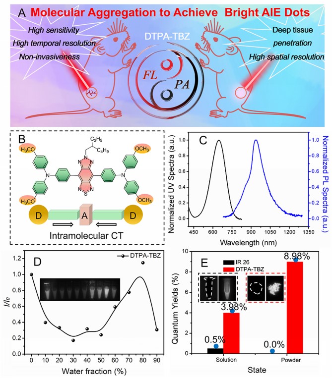 化学学院研究人员与中国科学院深圳先进技术研究院的研究人员合作,从分子结构的设计出发,实现了分子聚集程度的有效调控,从而构筑了一种具有高效NIR-II发射特性的聚集诱导发光材料(aggregation-induced emission,AIE) 及其纳米体系。相较于商用染料,该AIE纳米材料的相对荧光量子效率可达11.1%,并且显示了优异的斯托克斯位移及良好的光学稳定性能;在此基础上,研究人员也实现了该类材料在近红外二区荧光和近红外一区光声的双模式成像应用,成功实现了其对小鼠体内脑血管、腹部血管、后肢血管的高分辨荧光成像以及4T1肿瘤的靶向成像和3D光声成像。上述工作为高亮度聚集诱导发光材料的构筑及成像应用研究提供了新思路。