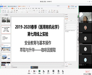 思源学堂平台和陕西省化学虚拟仿真实验教学中心平台以及中国慕课网等的丰富教学资源,化学实验教学中心根据《医用有机化学实验》课程特点,设计采用“第三方直播平台(腾讯会议、雨课堂、钉钉等)+虚拟仿真化学实验项目+实验测试题+家庭实践活动+实验报告”等综合性、立体化在线实验教学手段的线上教学方案。首次课程内容为安全教育、基本操作、虚拟实验教学项目(天然产物中有效成分的分离分析虚拟仿真实验,该项目是我中心已被评定为省级虚拟仿真实验教学项目)。