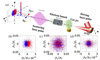图1.(a)利用椭圆偏振激光脉冲与相对论电子束对撞的非线性康普顿散射直接产生自旋极化电子束示意图。(b)、(c)和(d)分别为椭圆偏振、圆偏振和线偏振激光脉冲作用下的电子自旋分布。