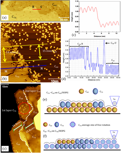 理学院陈光德课题组与英国伯明翰大学物理与天文学院NPRL的Dr. Quanmin Guo课题组合作,介绍了一种新型的定向外延生长的分子范德瓦尔斯异质结。与传统的异质结不同,这种新型异质结,组成仅为有机分子,内界面以及分子间都是以范德瓦尔斯力相互作用组装在一起,这个过程中并未引入任何氢键或者离子键。室温下,在高定向热解石墨(HOPG)表面顺序沉积C60和C70两种分子,制备出了双层范德瓦尔斯异质层。研究发现了常温下HOPG表面C70自组装分子层中C70分子全部处于自由旋转状态;当引入C60分子后,C70分子的旋转状态会受到引入的C60分子的调控,可以选择性的站立或自由旋转,并从分子层面上揭示了这种调控的机理。这个发现可以用于研究其他涉及到非球状颗粒系统,甚至胶体系统。