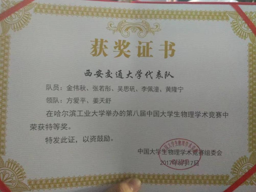 代表队参赛师生经过近10个月的精心准备与不懈努力,在竞赛中以严谨的科学态度、扎实的理论功底、巧妙的实验构思、机敏的论辩思维、默契的团队协作赢得评委专家的认可和好评,首次获得特等奖,并进入决赛,在决赛中,西安交大代表队继续发挥出色,获得第三名的历史最好成绩。金伟秋同学获“最佳反方奖”。