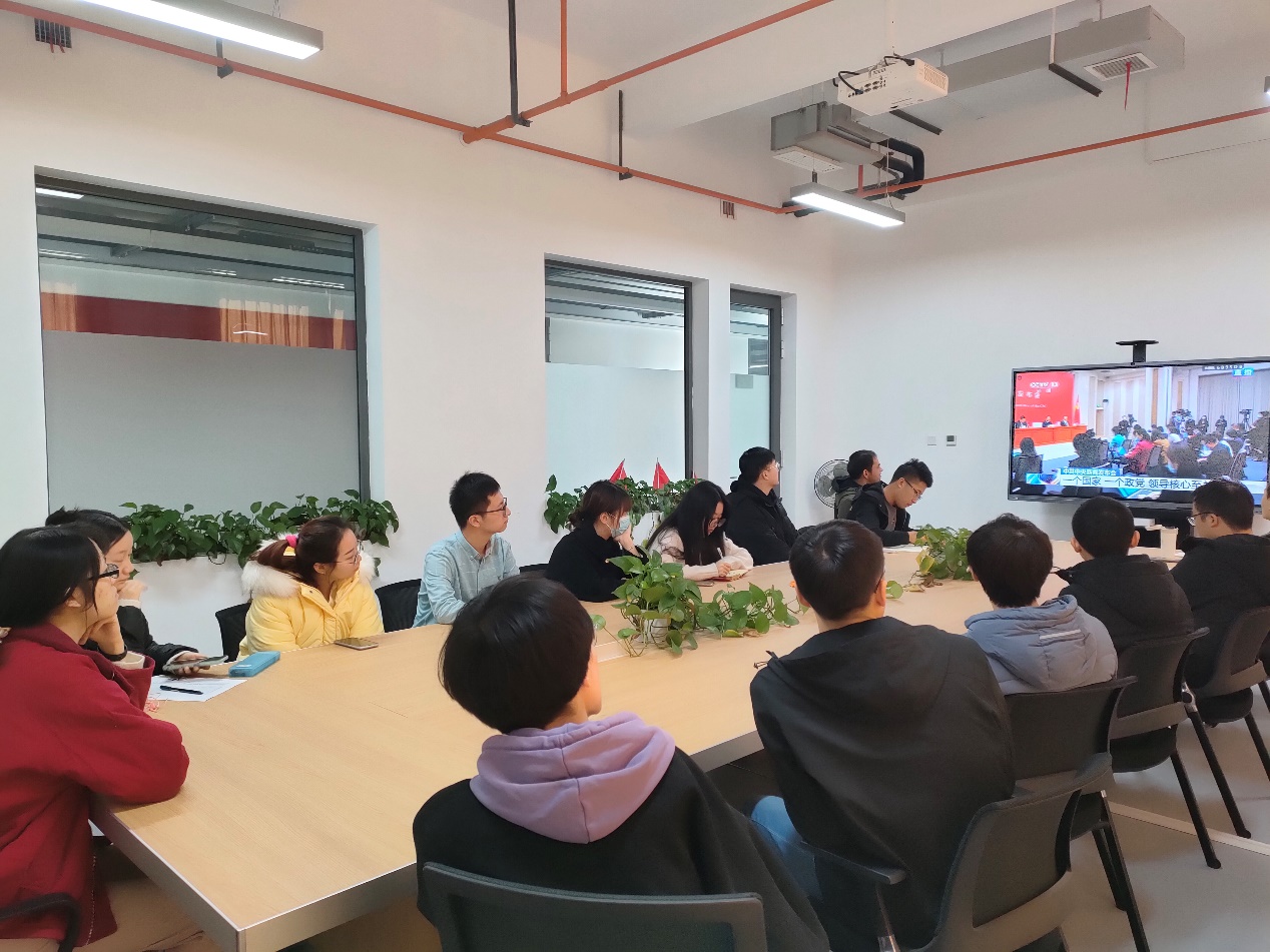 书记杨小渭、师生各党支部代表分别在仲英楼B241、创新港4-2126观看直播,并对党的十九届六中全会精神介绍内容展开热议。