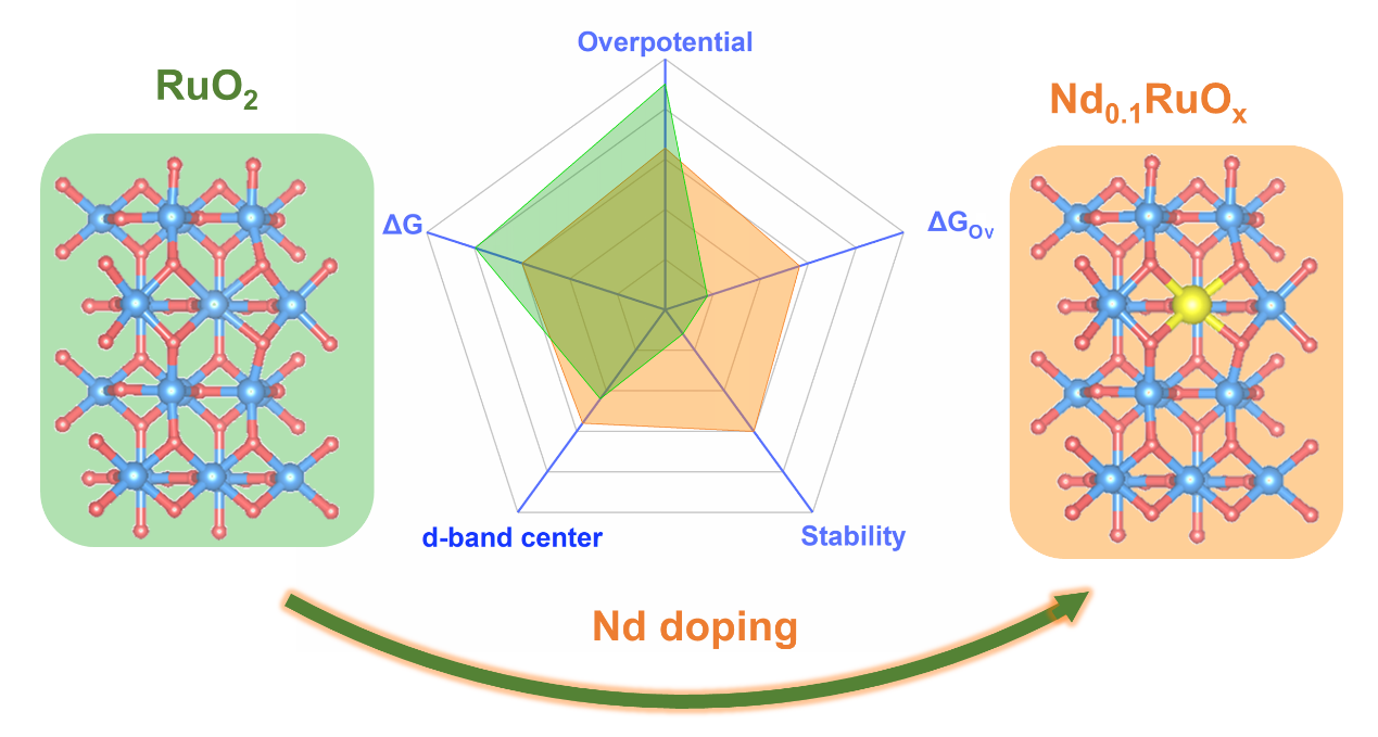 杨生春教授和王斌副教授基于d带中心理论,设计了能够在酸性电解液中稳定工作的Nd掺杂RuO2(Nd0.1RuOx)析氧催化剂,其在10 mA cm−2电流密度下的过电势仅为211 mV,并表现出优异的耐久性。理论计算表明,Nd的引入能够调控Nd0.1RuOx的d带中心能量,有效平衡了含氧中间体的吸附和解吸,降低了反应决速步(O*àOOH*)的能垒,从而加速了Nd0.1RuOx的析氧反应过程。此外,Nd掺杂还使得Nd0.1RuOx的O 2p能带中心下移,表明Nd0.1RuOx中Ru-O的共价性减弱,使其在热力学上不利于发生直接O-O耦合基元反应步骤。同时,Nd0.1RuOx中高比例的Ru4+有效抑制了析氧过程中Ru在酸性电解质中的溶解。将Nd0.1RuOx/CC作为析氧阳极组装于PEM电解槽中后可以在10 mA cm−2下稳定运行50 h,展示出优异的稳定性。该研究通过设计RuO2的电子结构,为酸性电解质中OER催化剂的设计提供了新思路。上述研究工作近日以(Optimizing the Electronic Structure of Ruthenium Oxide by Neodymium Doping for Enhanced Acidic Oxygen Evolution Catalysis)为题发表在国际知名期刊Advanced Functional Materials。论文第一作者为 拷贝漫画