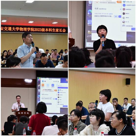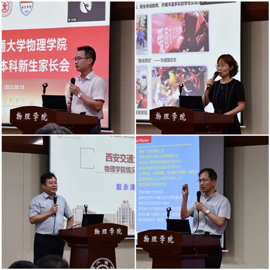 赵永涛教授首先代表学校和学院对2023届新生及家长表示欢迎,随后他从物理学是什么、如何学习物理学谈起,进而对学院的学科发展、专业培养、科学研究、师资队伍等情况做了详细介绍。徐慧老师对学校双院育人模式、书院的概况及学生工作特色做了阐述。李蓬勃教授对本科生培养方案及学籍管理方面的问题进行了解读。