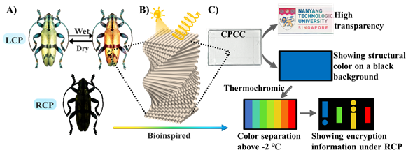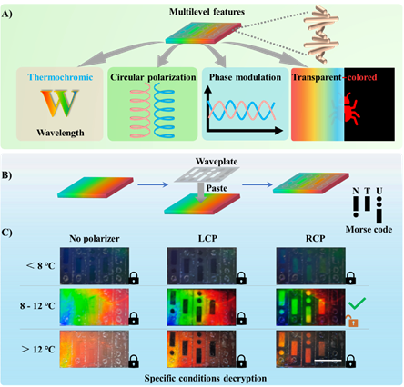 研究人员与新加坡南洋理工大学合作,从仿生的角度,通过从甲虫独特的变色能力和偏振特性中获取灵感,开发出一种兼具透明、热致变色和圆偏振特性的胆淄相纤维素复合材料(CPCC)。通过将自组装形成的胆淄相液晶结构的羟丙基纤维素嵌入到聚(N-异丙基丙烯酰胺)(PNIPAM)网络中,获得了PNIPAM交联的胆淄相纤维素薄膜。结果发现通过调节紫外线照射时间可以改变PNIPAM的交联度,进而调控胆淄相纤维素薄膜的热致变色行为。而且由于复合薄膜中的胆淄相只能反射右旋圆偏振光,当与波片结合时,反射光的旋转方向会发生翻转,因而在有波片区域和无波片区域展现出亮度不同的结构色。此外,CPCC的透明度极高,可与环境完美融合,提供了良好的伪装效果。进一步将CPCC独特的热致变色、圆偏振和透明特性与摩尔斯编码技术相结合,可以产生多级信息加密效果,有效提高了加密信息的安全性。这一材料的获得为进一步设计和开发高安全性信息加密和防伪材料提供了新的思路和方向。