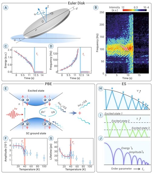 在量子材料中,激发态一般是指能量比基态更高的态。电子在激发态和基态之间跃迁。量子材料中的声子瓶颈效应发生在电子从激发态回到基态的超快弛豫过程中,是相变附近的微观量子态动态现象(图1中的E图)。而欧拉盘是经典物理现象,其命名来自欧拉1765年前对刚体运动进行的研究,后人将转动的圆盘称为欧拉盘。通过对比经典物理中的欧拉盘和量子体系的声子瓶颈效应之间的相似性和内在关联,研究者提出了从普适角度来看待激发态物理的认知,给出强度量和广延量的不同行为特征,跨越了经典和量子物理。