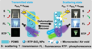 研究人员创新性地提出了集成透射光、散射光、荧光(FL)和室温磷光(RTP)的多模式光学信号响应系统构建策略。通过高温煅烧包覆荧光碳点(CDs)的单分散SiO₂纳米球(SiO₂ NPs),成功制备出兼具单分散特性、均匀球形形貌与长寿命室温磷光的RTP-SiO₂ NPs,实现了物理光调制结构与化学发光的有效兼容。进一步将RTP-SiO₂ NPs与聚二甲基硅氧烷(PDMS)复合,构建了多光学形态集成的弹性体(MOME)。在外力拉伸或挤压作用下,材料内部微裂纹和微空隙的形成导致折射率失配,使MOME呈现从透明态向白色散射态的可逆转变。尤为突出的是,形变诱导的散射增强显著提升了材料的FL和RTP发光强度。此外,MOME还展现出独特的动态调控特性,包括磷光衰减过程中的形变调控效应、溶剂-形变协同响应的光学开关行为等。据文献调研,这是目前首例实现形变诱导FL与RTP自散射增强且动态可逆调控的报导。