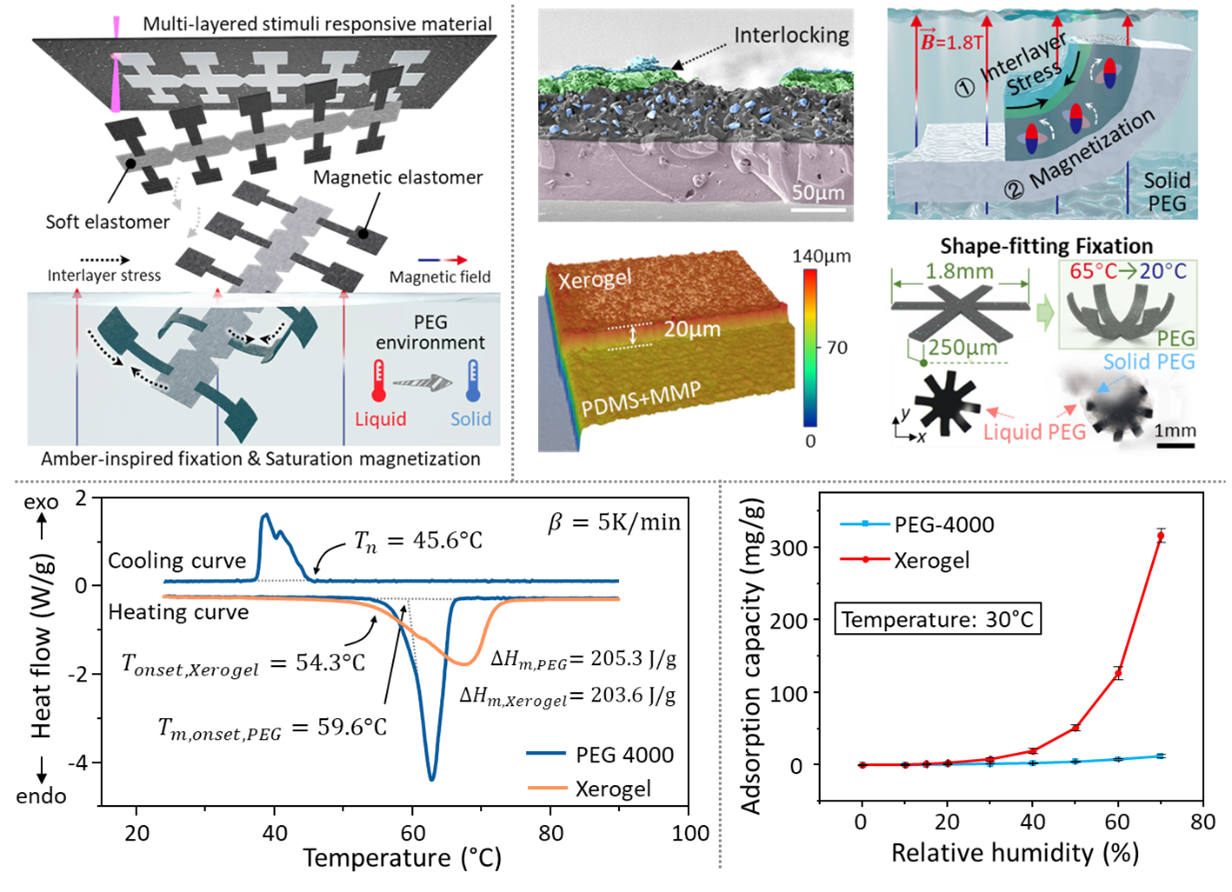 先进功能材料与器件物理团队青年优秀教师韩捷等受“琥珀固化”现象的启发,提出了一种无需模板的三维磁畴编程新策略。团队构建了由干凝胶、激光诱导石墨烯(LIG)与磁弹性体组成的三层异质材料体系,利用其三维互联微孔道结构,实现超亲水-超疏水界面的稳定连接。干凝胶层在温/湿场中收缩,诱发层间应力,从而驱动微结构实现精确三维变形。随后采用高精度的飞秒/皮秒激光加工技术,实现逐层构型与应力编程图案化,特征尺寸优于20μm,具备秒级制备效率。最终在饱和磁场下完成磁化,并通过水洗去除PEG和干凝胶层,成功实现了微型磁控软体机器人的一致性、批量化制备。该研究不仅提出了一种全新的磁畴编程范式,同时为物理智能微型机器人在生物医疗、微流控及智能集群等领域的应用奠定了基础。