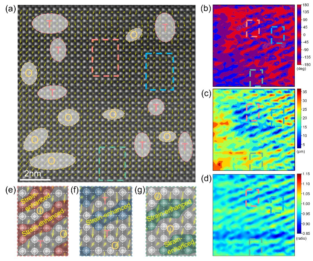 图1(a)沿[001]电子束入射方向的(Ba0.84Ca0.16)0.985Bi0.01(Ti0.9Zr0.07Sn0.03)97/100Hf3/100O3体系的原子分辨HAADF-STEM极化矢量图。(b)极化角度分布映射图。(c)极化强度分布映射图。(d)B位离子空间占比映射图。(e-g)应变增强玻璃态共存极性区的放大展示图。