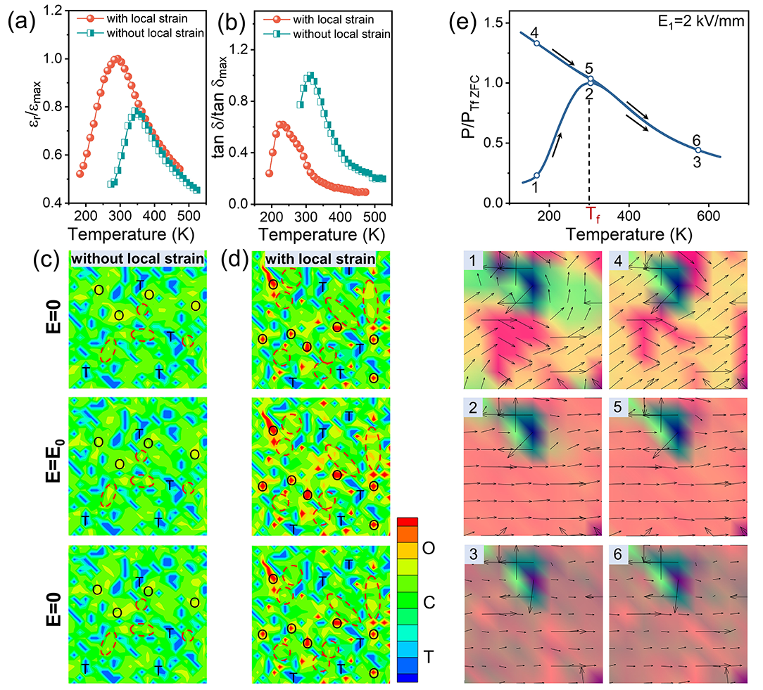 图2(a-b)引入局域应变场和不引入局域应变场条件下的归一化介电常数εr和介电损耗tanδ温度依赖曲线。(c-d)无局域应变场和有局域应变场时,小电场诱导微观纳米畴结构的演化。(e)有局域应变场时,多相共存纳米畴的零场冷和大场冷却条件下的极化响应的温度依赖曲线及相应的畴结构演化过程。
