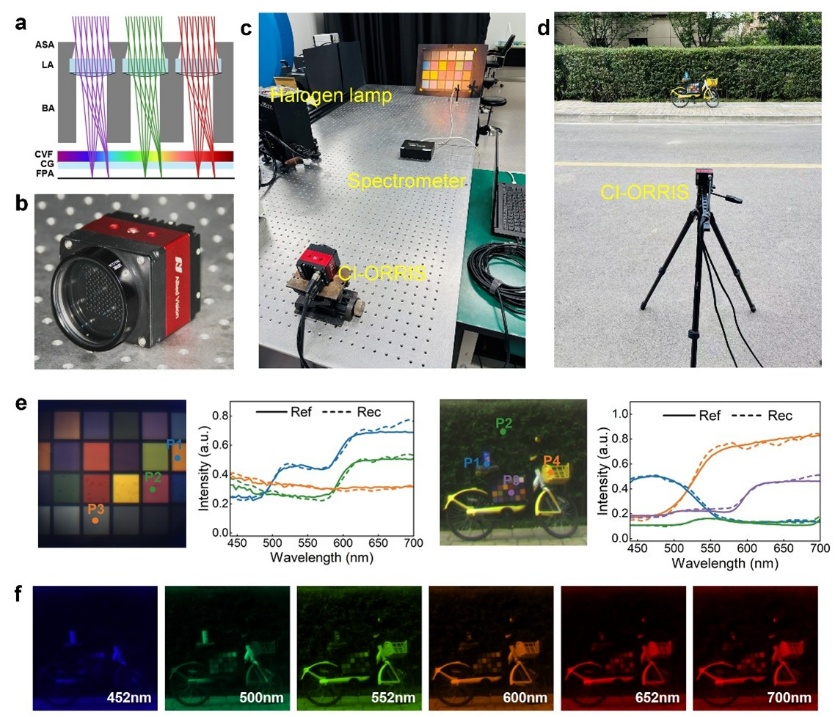 穆廷魁教授团队创新性地提出了“多空间-光谱编码(MSA-SE)”机制,通过构建“空间编码+光谱编码+空间复用增强”的高维像素级编码模型,有效增加了编码信息量进而提升光谱重构精度。在软件上,开发了基于Transformer的深度学习重构网络和性能指标评价约束算法。在硬件设计上,将MSA-SE模型集成至自主研发的微型化光谱成像系统ORRIS(Optics Letters 44, 1281-1284,2019;Optics and Lasers in Engineering 169, 107717-1-15,2023),构建了CI-ORRIS系统,可在单次曝光中获得多张具有不同空谱编码测量的子图像。实验结果表明,CI-ORRIS系统具有良好的窄带和宽带光谱重建性能,最高光谱分辨率达3.7 nm。同时系统可在单次快照下重建440-700 nm波段的66个波长通道,并成功用于室内外复杂场景的光谱成像与分析,实现了单次曝光下的多次编码测量,大幅提升光谱分辨率,具备更高的系统灵活性与应用适应性。