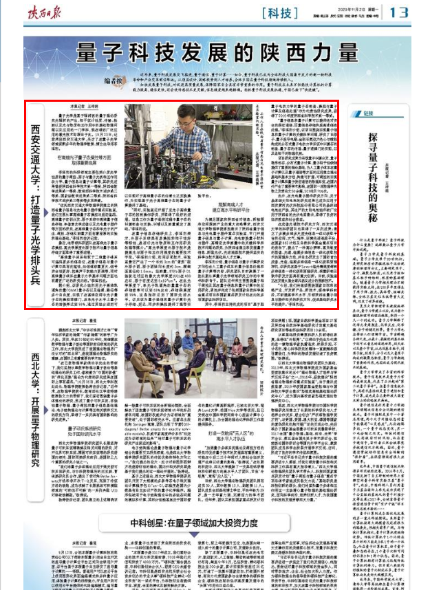 建立的陕西省量子信息与光电量子器件重点实验室,我们主要从事高维量子态操控与超密编码、高维量子密钥分发、原子系综中高维量子信息存储、单像素光学成像以及光电量子器件等方面的研究,在高维量子态和单光子的产生、调控、存储及测量方面有着深厚的实验和理论基础。”李福利告诉记者。