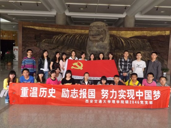 春意渐去,夏意袭来,2013年4月14日下午,理学院硕2046党支部的党员同学们前往陕西省历史博物馆开展了主题为“回顾历史 立志报国 努力实现中国梦”的参观活动。此次出行是该支部“中国梦”系列活动之一,在此之前硕2046支部已经开展了主题讨论、座谈等相关活动。随着“中国梦”系列活动的推展,硕2046党支部的成员们的“中国梦”正在跃然生发。