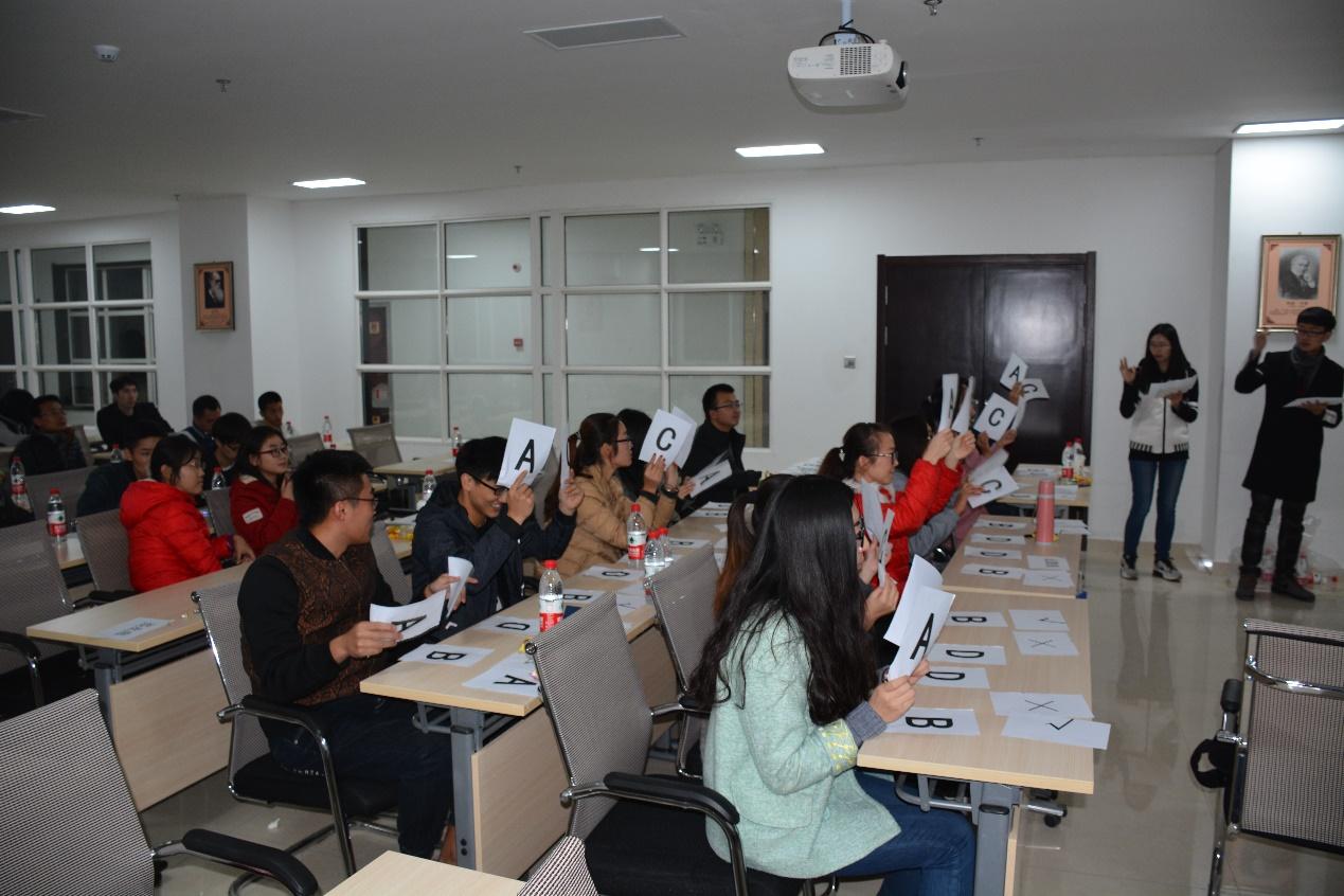 在答题环节,同学们按照现场座位上参赛人员的名字,对号入座,桌上有a.b.c.d和对、错的纸牌,答题时举起示意。比赛共分为两轮:第一轮是淘汰赛,题目为单项选择,全部参赛者一同举牌,决出得分最高的10名参赛者进入第二轮。因为是淘汰赛,大家都很谨慎。为了缓解第一轮的紧张气氛,大会还设计了互动环节,附加题答对着领取精美笔记本一个,现场气氛达到了高潮。第二轮晋级赛,由第一轮得分最高的10名参赛者按照第一轮相同规则举牌,题目分为多项选择和判断题,同样以分数高低排名,决出一等奖3人、二等奖3人、三等奖4人。