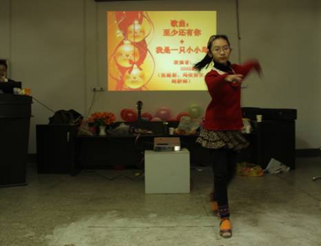 随后,众多同学纷纷拿出自己的才艺,将节日的气氛渲染得热烈而温馨。在女生歌曲串烧中,伴随着歌声一幅幅照片将大家带入了两年多以来温馨的回忆之中,萨克斯独奏与中阮独奏师生以艺术的熏陶,张雯老师的女儿也为大家献上拉丁舞一支,渲染出浓厚的节日气氛。