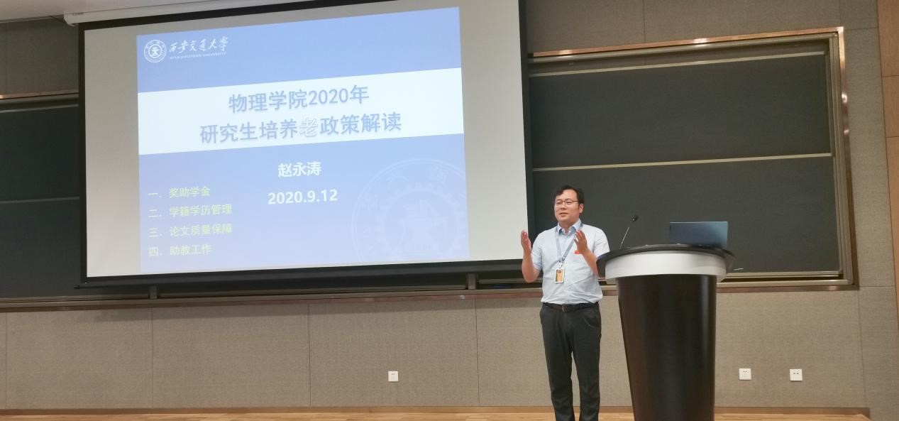 赵永涛副院长向同学们解读了研究生培养相关政策,对研究生奖助金、学籍学历管理规定、学位论文质量保障实施细则等进行了详细解读,对物理学科情况和研究生培养注意事项进行了介绍。