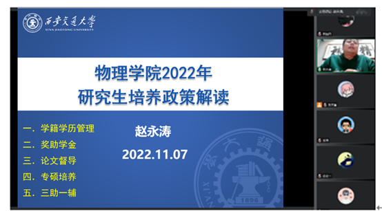 首先由赵永涛副院长为同学们介绍拷贝漫画 研究生培养管理政策。他重点就研究生学籍学历管理规定、奖助学金、论文督导、专硕培养、三助一辅五个方面为同学们详细讲解了学院研究生培养管理政策。他强调学位论文是研究生学习、科研、实践的重要组成部分,鼓励同学们一定要端正自己的科研态度,培养良好学风,学有所得,写出合格的高质量的学位论文。